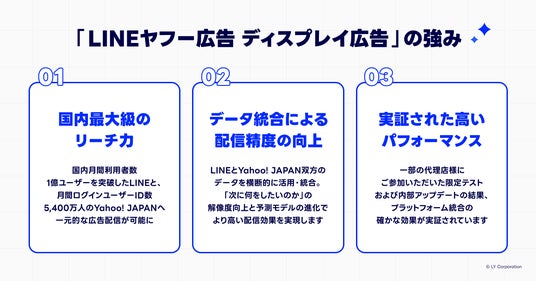 LINEヤフーは、国内最大級のリーチとデータ基盤を誇る新たな広告プラットフォーム「LINEヤフー広告 ディスプレイ広告」を通じて、企業とユーザーの最適なマッチングを創出し、企業のビジネス成長を力強くサポートしてまいります。