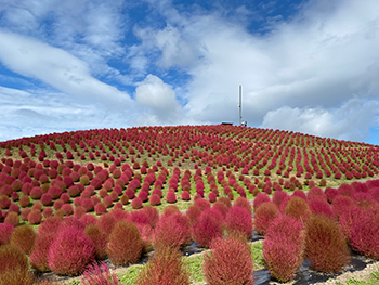 園内にある「みはらしの丘」では、約3万3000本のコキアが植栽され、もふもふのコキアが一面に広がります。例年10月上旬より少しずつ紅葉し始め、10月中旬には真っ赤に染まります。ぜひ施設のSNSもチェックしてみてください。