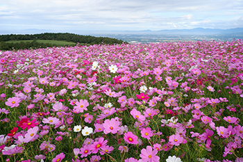 熊本市内を一望できる「みはらしの丘」をはじめ、約150万本のコスモスが咲き誇り、ピンクのグラデーションがかわいらしく牧場を彩っています。場内では、牛やヤギ、羊などの動物とのふれあいや、バターやアイスなどの手づくり体験が楽しめます。