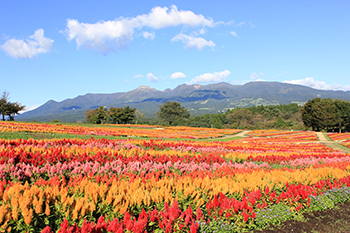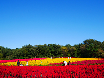 那須連山を眺められる高原にあるフラワーパーク。秋になると、8品種25万株約300万本ものケイトウが、赤、ピンク、黄色、オレンジと一面を艶やかに彩ります。開花時期が長いことから花言葉が「永遠の愛」ともいわれる鮮やかなケイトウは圧巻の見応え。