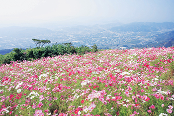 標高586mの鷲ヶ峰頂上に位置する広大なコスモス園。天気の良い日には、はるか遠く淡路島や四国まで見渡せる、まるで天空のコスモス園!約100万本の花々はまるで油絵のような鮮やかさで、周囲の木々も低く、コスモスと絶景のコラボレーションが楽しめます。