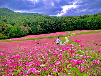 標高900m、広さ約4.2haの広大な畑に、日本でも珍しい赤そばが咲き誇ります。見渡す限りルビー色に染まる赤そばの絨毯はまさに絶景!花畑の入口には、赤・白の2色のそばが食べられるそば処や農産物の直売所もオープンしています。見頃にあわせて「赤そばの里祭り」も開催予定。