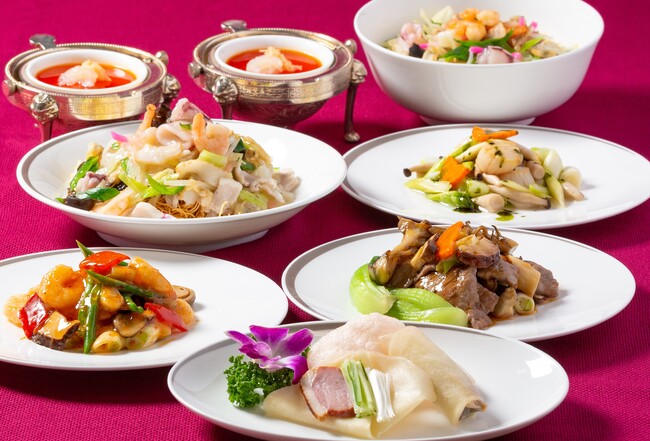 提供内容:『翡翠コース』では「帆立貝と季節野菜のそのぎ茶炒め」をご提供します。麺物では「長崎ちゃんぽん」又は「長崎皿うどん」をお選びいただけます。