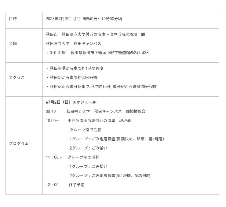 あきた海ごみゼロプロジェクト実行委員会は、2023年7月2日に秋田県の海岸に季節的に出現すると言われる全国的にも珍しい、砂浜の斜面にごみが埋まっている層「ごみ地層」に関しての調査を秋田の海岸沿いにある秋田県立大学・エコの環サークルの協力を得て行います。調査では、ごみが多く「ごみ地層」があると見られる場所を絞り込み、掘削してごみの量や種類などを調べます。