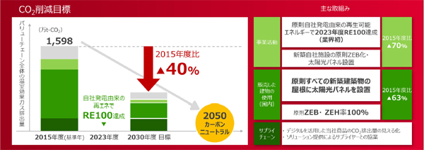 事業活動では、RE100(再エネ利用100%)の達成を当初目標の2040年度から2023年度にするとともに、2030年度の温室効果ガス排出量を2015年度比70%削減します。まちづくりでは、2030年度までに建設および開発する全建物を原則ZEH・ZEBに切り替え、太陽光発電設備を搭載することにより、2030年度の温室効果ガス排出量を2015年度比で63%削減します。