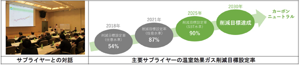 サプライチェーンにおける温室効果ガス排出量はバリューチェーン全体の約2割を占める重要な排出源であるため、2019年より主要サプライヤーとの対話を実施することにより、現在主要サプライヤーの87%が温室効果ガス削減目標を設定しています。今後も引き続き主要サプライヤーとの連携を深め、2025年度には主要サプライヤーの90%以上とSBT(※2)水準の温室効果ガス削減目標を共有するとともに、当社が展開する環境エネルギー事業のソリューションを提案することにより、2030年度までに主要サプライヤーの温室効果ガス削減目標の達成を目指します。