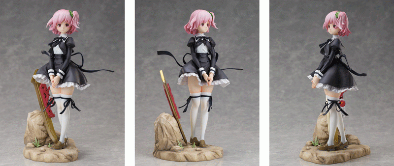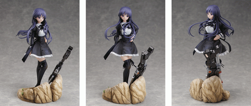 特徴的な黒く長い髪は、キメ細やかな毛流れをグラデーション加工と造形で美しく仕上げました。黒を基調とした百合ヶ丘女学院の制服は同じ黒色のニーハイソックスやローファーとのバランスを考え、光沢など細かな部分までこだわりました。荒野の台座に立てかけられた銃剣「ブリューナク」が“ヒュージ”との戦いを連想させます。幼紫色に透き通った瞳で凛とこちらを見つめるクールな夢結がご堪能いただけます。
