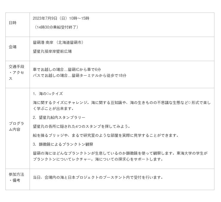 これにあわせ、一般社団法人 北海道海洋文化フォーラムは同会場内で、海や海洋生物について楽しく学ぶことができる「海と日本プロジェクトコーナー」を開設し、海に関する〇×クイズや、望星丸船内を巡るスタンプラリー、顕微鏡を使ったプランクトンの観察(協力 東海大学)など、参加者に海について楽しく学ぶ機会を提供します。