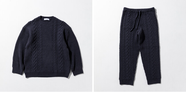 今回の別注カラーには展示会にて男性人気の高かった、ハリと弾力性にこだわって編んだ軽やかなスフレ素材のアイテムをピックアップ。アランニット風に仕上げた風合い豊かなプルオーバー、ロングパンツはふわっと弾むような素材感で最高のリラックス時間を演出します。ジェラート ピケで取り扱いのあるネイビー、アイボリーに加え、独特な表情で着こなしに抜け感を与えてくれる“グレー”を別注カラーでご用意しました。