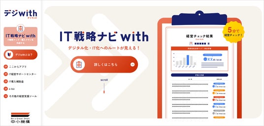 事業者のデジタル化を後押しするためのポータルサイト。事業者のデジタル化の状況を同業他社と比較することが可能です。5分ほどの簡単なアンケートに答えることで経営の悩みを解決するためのITソリューションを提案する「IT戦略ナビwith」、具体的な業務用アプリやIT導入事例を探せる「ここからアプリ」、ITの専門家へ気軽にオンラインで無料相談できる「IT経営サポートセンター」など、様々なメニューで事業者のデジタル化をサポートします。