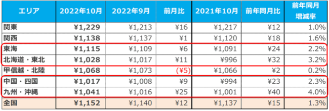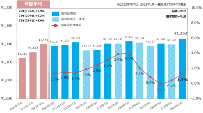 22年10月の全国平均時給は1,152円(前月比:+12円、前年同月比:+15円)で、前月比・前年同月比ともに増加し過去最高額を更新した。【図1】