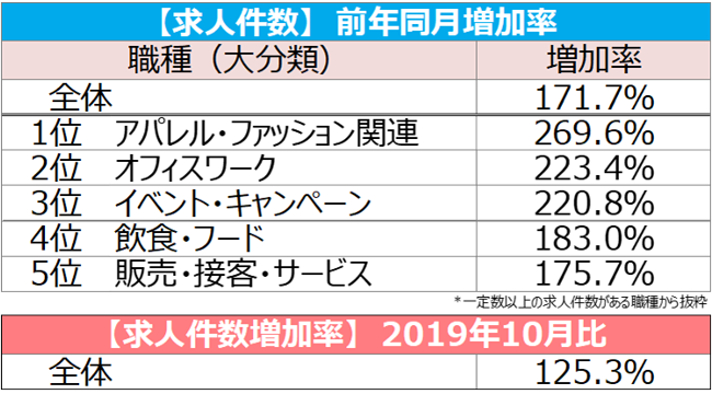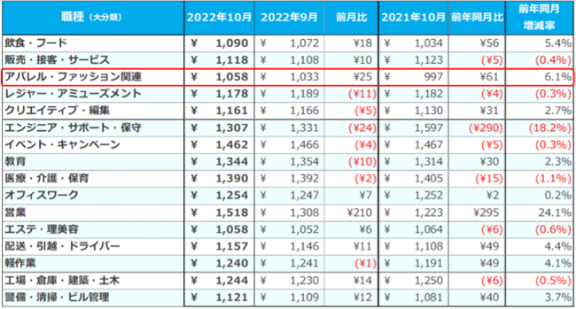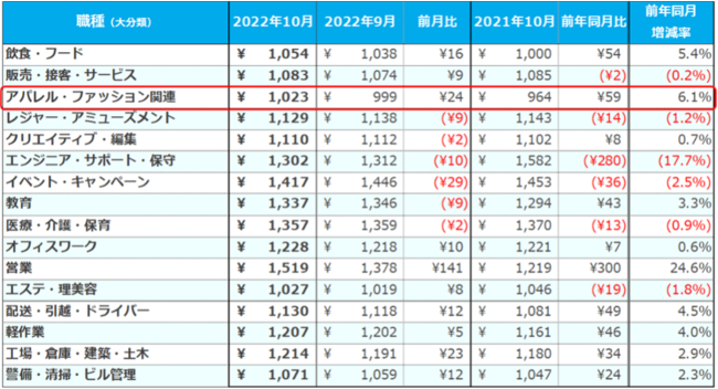 職種(大分類)別では、2020年1月の調査開始以来はじめて全16職種で平均1,000円を超えた。特に[アパレル・ファッション関連]では1,023円(前月比:+24円、前年同月比:+59円)となり、過去最高額を更新。求人件数は前年同月比で2.7倍に増加した。