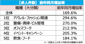 職種(大分類)別でみると[アパレル・ファッション関連]が1,058円となり、前月比で25円の増加、前年同月比で61円の増加(増減率:+6.1%)で過去最高額を更新。求人件数では、前年同月比で2.9倍に増加した。その他、全16職種の平均時給は、前月比・前年同月比ともに9職種が増加、7職種が減少となった。【図6、7】