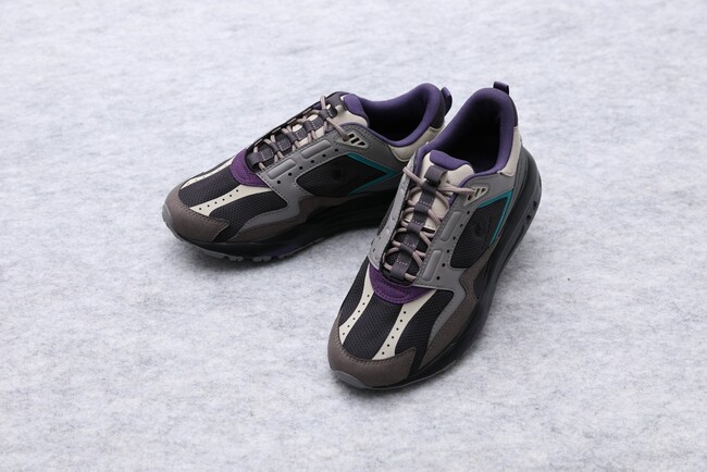 アッパーは大人の足元に似合うグレージュのカラーをベースに、深みのあるパープルや鮮やかなブルーグリーンを効かせ、ソールには艶のあるブラックを合わせました。