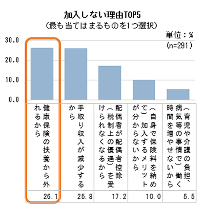 社会保険への加入意向を聞くと、全体のうち、半数程度は「分からない・検討中」ではあるものの、残り半数は「加入する」24.6%と「加入しない」26.1%が同程度でした。現在の年収別に見ると、130万円以上では「加入しない」が1割未満であるのに対し、130万円未満では約3割と差がありました。これは、社会保険の扶養の基準となる「年収130万円未満」、いわゆる「130万円の壁」を意識していることがうかがえます。実際、加入しない理由で一番多かったものは、「健康保険の扶養から外れるから」26.1%でした。