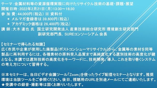 先端技術情報や市場情報を提供している(株)シーエムシー・リサーチ(千代田区神田錦町: https://cmcre.com/ )では、 各種材料・化学品などの市場動向・技術動向のセミナーや書籍発行を行っておりますが、 このたび「金属材料等の資源循環実現に向けたリサイクル技術の基礎・課題・展望」と題するセミナーを、 講師に大木 達也 氏 国立研究開発法人 産業技術総合研究所 環境創生研究部門 副研究部門長,SUREコンソーシアム 会長)をお迎えし、2022年2月21日(月)13:30より、 ZOOMを利用したライブ配信で開催いたします。 受講料は、 一般:44,000円(税込)、 弊社メルマガ会員:39,600円(税込)、 アカデミック価格は26,400円(税込)となっております(資料付)。