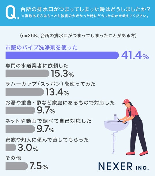 「市販のパイプ洗浄剤を使った」を選んだ人は41.4%ともっとも多く、次に「専門の水道業者に依頼した」が15.3%、「ラバーカップ(スッポン)を使ってみた」は13.4%でした。