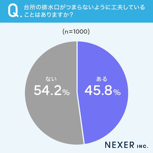 さらに45.8%の方が排水口に詰まらないように工夫しており、「生ごみ用ネット」や「こまめな掃除」などをしていると回答がありました。