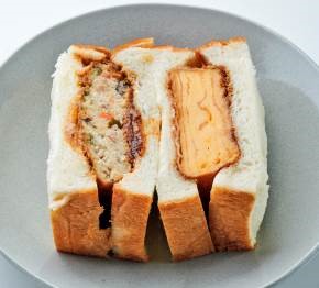 佃浅が手がける高級食パン専門店「題名のないパン屋」の食パンを使った本店限定のサンド。看板メニューの「卯の花」を使ったコロッケサンド、玉子カツサンドをセットにしました。