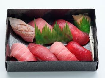 鮪仲卸ならではの握り詰め合わせ。普段は豊洲市場限定の商品。本鮪・インド鮪・バチ鮪の赤身、中トロ、さらに炙り大トロを贅沢に食べ比べ。