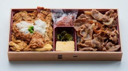 関西地区限定の大人気弁当をアレンジ。カツ丼と生姜焼き丼に、さらにエビフライを卵とじした、ボリューム満点の弁当です。