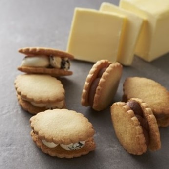 (上)発酵バター香る、しっとりバターサブレサンドが新登場。ラム酒漬けの レーズンの甘酸っぱい味わいのラムレーズン。フルーティーな酸味のあるほろ苦いチョコレートクリーム。発酵バターのさわやかな風味が口いっぱいに広がります。(下)香ばしいアーモンドスライスの風味を引き立てるため、軽く仕上げた木の葉型のファヤージュをこだわりの3種類のチョコレートで包み込みました。アーモンドの風味に、チョコレートの深いコクが重なり、濃厚でリッチな味わいが口いっぱいに広がります。