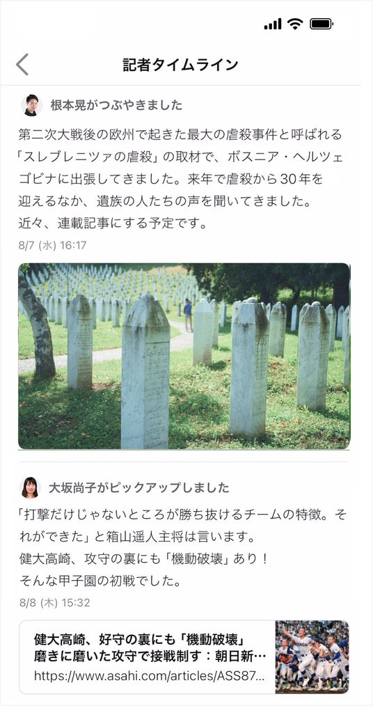 朝日新聞デジタルの記事を読んで気になった記者をフォローすると、その記者が注目した記事やつぶやきをタイムライン上でみることができるようになりました。