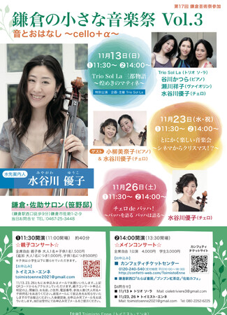 トイミスト・エンネ主催、『鎌倉の小さな音楽祭 Vol.3 』チェロ de バッハ! ~バッハを語る バッハは語る~が2022年11月26日 (土)に鎌倉・佐助サロン(笹野邸)(神奈川県鎌倉市佐助1丁目2-9)にて開催されます。
