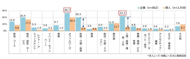 企業の求人ニーズが高い職種は、[オフィスワーク]が26.7%で最も高く、次いで[工場・倉庫・建築・土木]が22.3%。一方で、個人の求職ニーズの高い職種では、[オフィスワーク]が20.4%で最も高く、次いで[販売・接客・サービス]が17.2%となった。