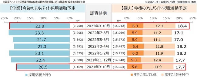 企業の求人ニーズ(次月以降にアルバイトの採用活動の予定がある企業の割合)は23.0%(21年9-10月比:+2.5pt)、また、個人の求職ニーズ(「次月以降の新しいアルバイトをすでに探している求職者」+「探すことを検討中の求職者」の合計)は18.4%(21年9-10月比:+0.7pt)となり、年末に向けアルバイトの採用活動・求職活動が活発化する様子がうかがえる。【図1】