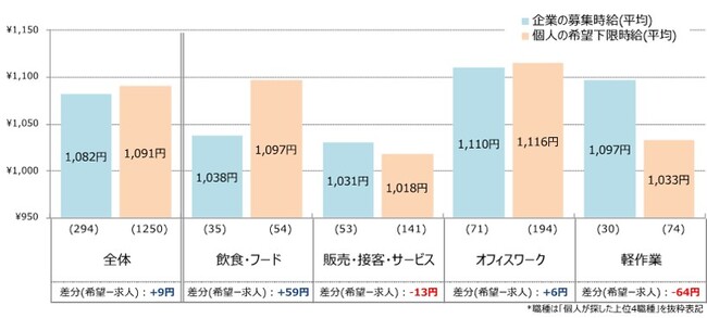 22年9-10月にアルバイトの仕事を探した人の希望下限時給の平均は1,091円、一方で、企業のアルバイト募集時給の平均は1,082円となり、9円ほど求職者の時給ニーズを満たしていない結果となった。