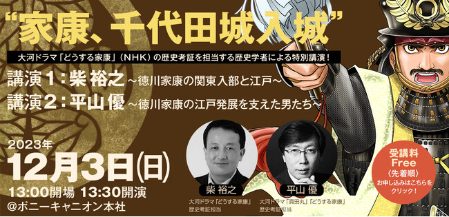 さらに、「家康、千代田城入城」をテーマにした歴史講演会が12月3日に開催されることも発表され、参加募集が開始された。講師には、現在放送中の人気ドラマの時代考証も務め、「戦う歴史学者」として人気の平山優(ひらやまゆう)氏と柴裕之(しばひろゆき)氏が登壇。演題は平山氏が「徳川家康の江戸発展を支えた男たち」、柴氏が「徳川家康の関東入部と江戸」をテーマにした基調講演を行う予定で、歴史ファンにとっては必聴の内容である。