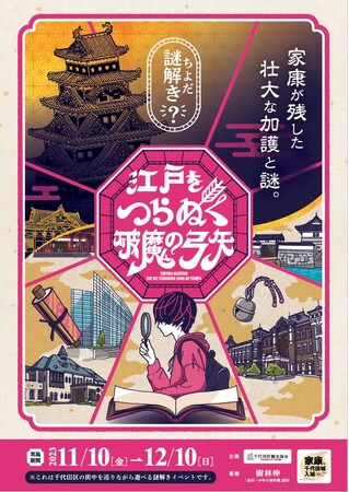 第一弾は、「ちよだ謎解き 江戸をつらぬく、破魔の弓矢」と題した、区内周遊の謎解きイベントを11月10日から12月10日までの期間で実施する。代表作「金田一少年の事件簿」等のミステリー作家が謎解き監修した、ミステリー度の深い、歴史探検謎解きゲームになっており、家康ゆかりの地を巡る3つのコースで構成されている。ゲームクリアした方には抽選で豪華賞品が当たる特典付き。参加方法は本プロジェクトのホームページでご確認してほしい。
