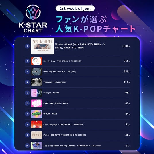 『K-STAR CHART presents POP-K TOP10 Friday』6月6日(金)の放送回において1位にVさん、PARK HYO SHINさんの曲「Winter Ahead (with PARK HYO SHIN)」が3週連続1位となりました。