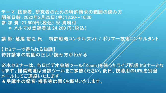 先端技術情報や市場情報を提供している(株)シーエムシー・リサーチ(千代田区神田錦町: https://cmcre.com/ )では、 各種材料・化学品などの市場動向・技術動向のセミナーや書籍発行を行っておりますが、 このたび「技術者、研究者のための特許請求の範囲の読み方」と題するセミナーを、 講師に鷲尾 裕之 氏 特許戦略コンサルタント / ポリマー技術コンサルタント)をお迎えし、2022年2月25日(金)13:30より、 ZOOMを利用したライブ配信で開催いたします。 受講料は、 一般:27,500円(税込)、 弊社メルマガ会員:24,200 円(税込)、 となっております(資料付)。
