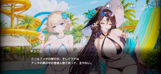 舞台はウォーターパーク、うたた寝から目覚めたユースティアは、キュウビに”夢の中”であることを告げられます。不思議な水着を着たまま、ウォーターパークをさまようユースティア、夢から覚めることはできるのか。