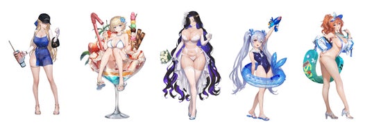 新コスチューム 左から)ウォーターパークの女王 ウィルヘルミナ、真夏の夢 ユースティア、夢の中の花嫁 エクリプス、水遊びの妖精 レピテア、水遊びの守護者 ジェニス