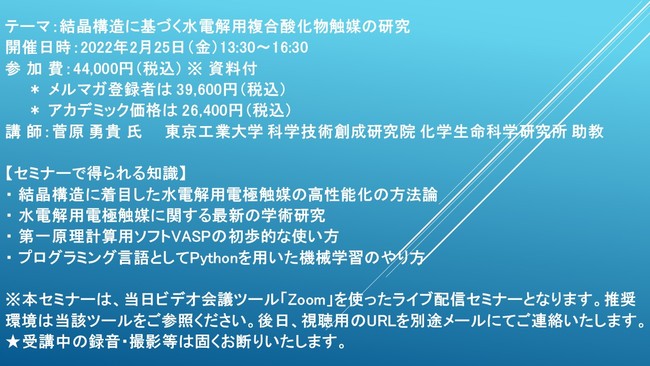 先端技術情報や市場情報を提供している(株)シーエムシー・リサーチ(千代田区神田錦町: https://cmcre.com/ )では、 各種材料・化学品などの市場動向・技術動向のセミナーや書籍発行を行っておりますが、 このたび「結晶構造に基づく水電解用複合酸化物触媒の研究」と題するセミナーを、 講師に菅原 勇貴 氏 東京工業大学 科学技術創成研究院 化学生命科学研究所 助教)をお迎えし、2022年2月25日(金)13:30より、 ZOOMを利用したライブ配信で開催いたします。 受講料は、 一般:44,000円(税込)、 弊社メルマガ会員:39,600円(税込)、 アカデミック価格は26,400円(税込)となっております(資料付)。