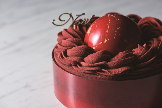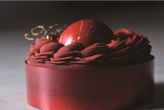 真紅が印象的なチョコレートケーキ。エクアドル産2種類のカカオの風味が際立つムースとココア風味の濃厚なビスキュイを組み合わせ、重厚さと軽さがバランスよく融け合います。真っ赤なチョコレートを霧状に吹き付け、ベルベットのような質感が華やぎを添える毎年一番人気の一台を、今年デザインを新たにしお届けします。