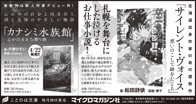 マイクロマガジン社(東京都中央区)は、ことのは文庫より『サイレント・ヴォイス 想いのこして跡をたどる』(著:松田詩依/イラスト:夢子)、『カナシミ水族館 心が泣き止む贈り物』(著:夕瀬ひすい/イラスト:chooco)を4月19日の北海道新聞に掲載いたしました。
