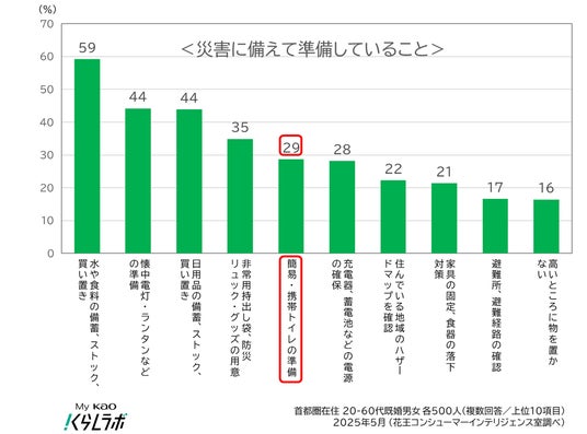 花王株式会社では、災害時のトイレ対策の重要性とそのための家庭での備えと対策を、2025年5月の防災に対する意識実態の調査結果と共に、「My Kao くらしラボ(※1)」にて2025年8月19日に公開しました。