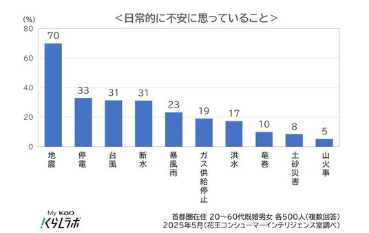 2025年5月の首都圏での調査で、日常的に不安に思っていることの1位は、「地震」が70%で、他を大きく引き離していました。以下、「停電」33%、「台風」、「断水」が31%で続きました。発生確率が高まっている首都直下地震に対する不安や、大型化する台風、災害以外でも起こりえる電気や水が使えなくなることに対する不安が見受けられました。