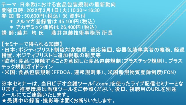先端技術情報や市場情報を提供している(株)シーエムシー・リサーチ(千代田区神田錦町: https://cmcre.com/ )では、 各種材料・化学品などの市場動向・技術動向のセミナーや書籍発行を行っておりますが、 このたび「日米欧における食品包装規制の最新動向」と題するセミナーを、 講師に藤井 均 氏 藤井包装技術事務所 所長)をお迎えし、2022年3月1日(火)10:30より、 ZOOMを利用したライブ配信で開催いたします。 受講料は、 一般:50,600円(税込)、 弊社メルマガ会員:45,100円(税込)、 アカデミック価格は26,400円(税込)となっております(資料付)。