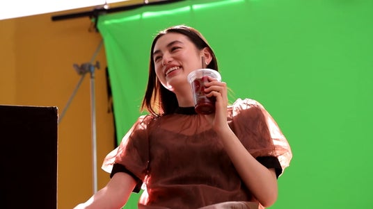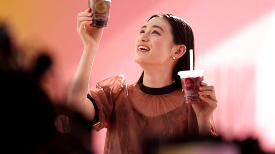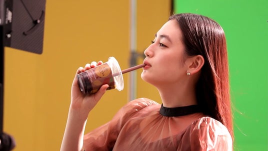 「ゴディバWチョコレートフラッペ」と「ゴディバストロベリーチョコレートフラッペ」を見比べながらゆっくり持ち上げるシーンでは、「カット」の声が掛かっても商品を持ち上げ続け天まで昇るような演技で周囲を笑わせる一幕も。