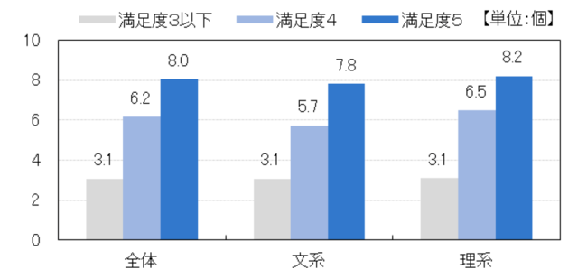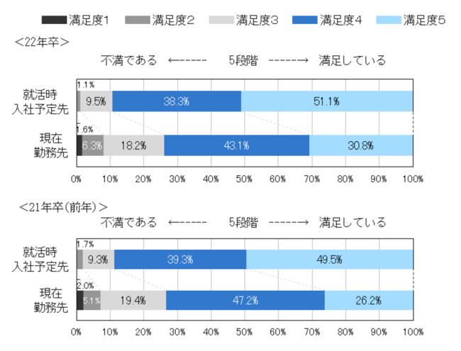 就職活動時の入社予定先と入社半年後の勤務先満足度(5段階)を比較すると、最も満足度の高い「満足度5」を選んだ割合は30.8%で就職活動時(51.1%)より20.3pt減少した。満足度3以下の割合は、入社半年後26.1%で、就職活動時(10.6%)より15.5pt増加した。一方で入社半年後の「満足度5」の割合は、21年卒(26.2%)に比べると4.6pt高い結果となった。【図2】