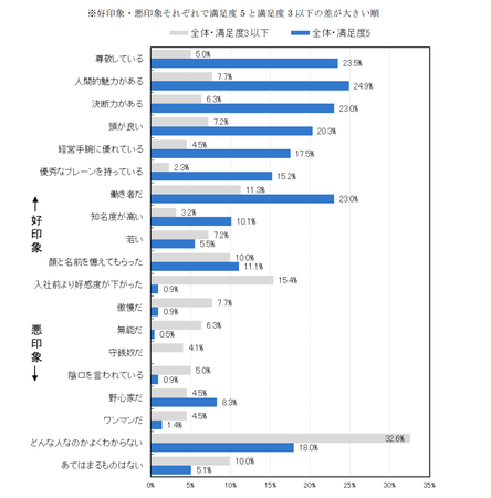 社長や経営者に対する「好印象」「悪印象」についてあてはまるものを選んでもらい、勤務先満足度の関係を分析したところ、満足度が5の人は3以下の人に比べ、「好印象」の数が多くなった。満足度5と3以下で最も差がついたのは「尊敬している」で、次いで「人間的魅力がある」だった。また、そもそも評価をしようにも「どんな人なのかよくわからない」という割合は、満足度5が18.0%に対し、3以下は32.5%にのぼった。【図6】