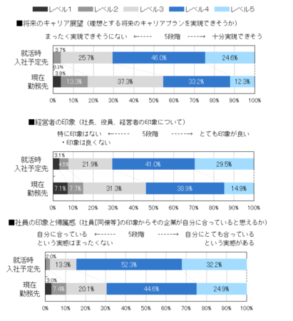 満足度に影響した要因についてそれぞれ就活時と入社半年後で「レベル1」(最低評価)~「レベル5」(最高評価)の5段階で評価してもらい比較すると、就活時と入社半年後で最も変化があったのは「将来のキャリア展望(理想とする将来のキャリアプランを実現できそうか)」(レベル5が12.3pt減、レベル3以下が25.0pt増)で、次いで「経営者の印象(社長、役員、経営者の印象について)」(レベル5が14.6pt減、レベル3以下が16.6pt増)だった。これらの要因が入社半年後の勤務先満足度に強く影響したと考えられる。【図3】