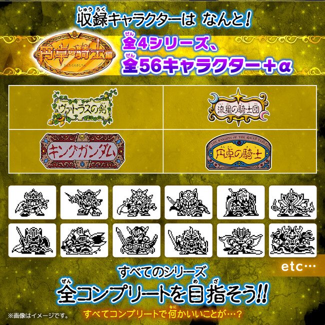 ジークジオン編には、全6シリーズ、72種以上、円卓の騎士編には、全4シリーズ、56種以上のキャラクターが収録されています。