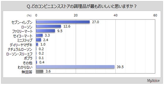 調理品が最もおいしいと思うコンビニエンスストアは、「セブン‐イレブン」が27.0%でトップ、「ローソン」が12.6%、「ファミリーマート」が9.5%です。「わからない」が39.5%となっています。