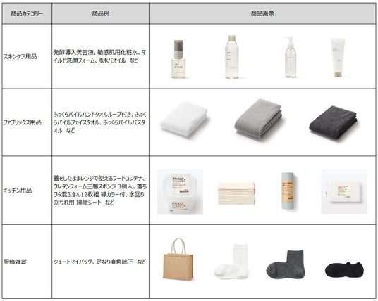 取り扱い商品は、全国の無印良品でも人気のスキンケア用品や靴下をはじめ、タオル類や調理小物など、約70アイテムを取り扱います。今後、ラインナップをさらに拡大していきます。